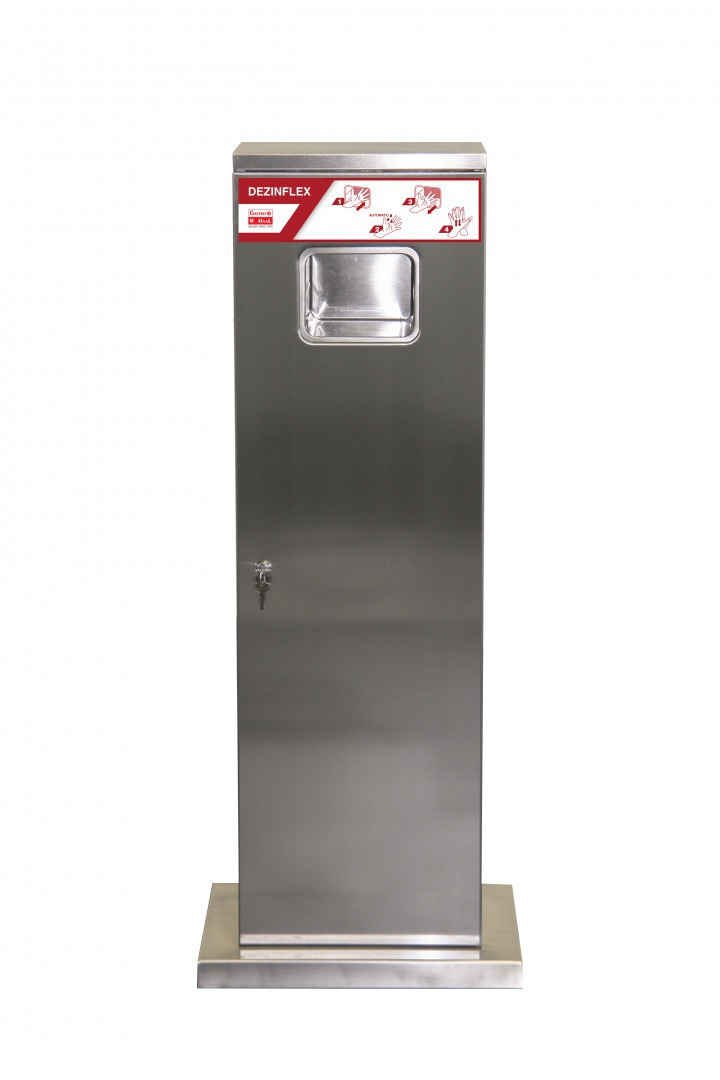 Bezdotykový dávkovač dezinfekcie na ruky.